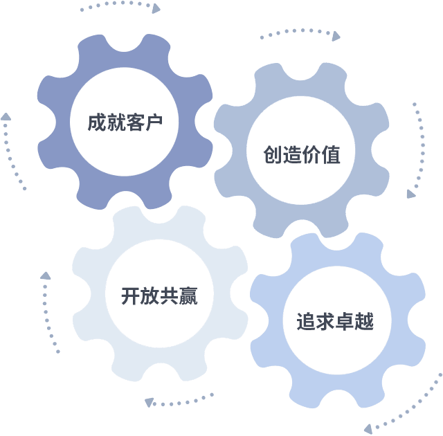 成就客户是一切决策的出发点,,创造价值是衡量所有工作的标准,,,追求卓越是我们做事做人的态度,,,开放共赢是我们的格局也是最终的结果。。价值观的齿轮环环相扣,,,,推动着组织里的每个人不断向前。。
